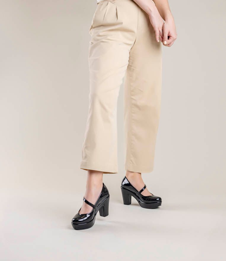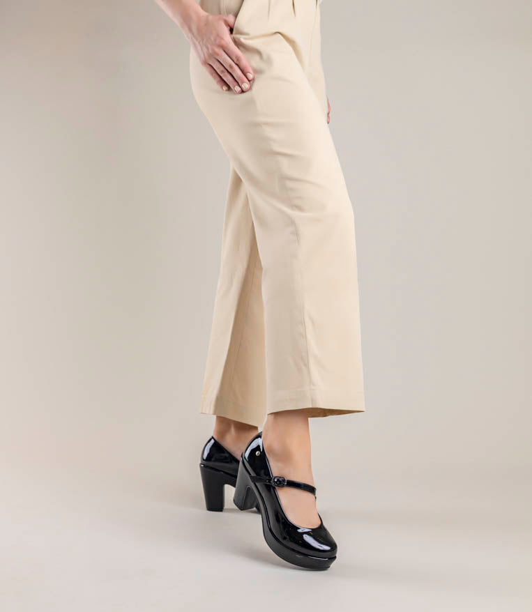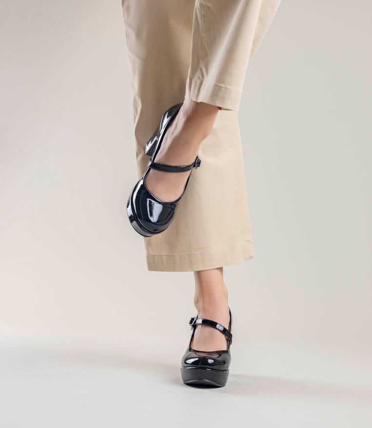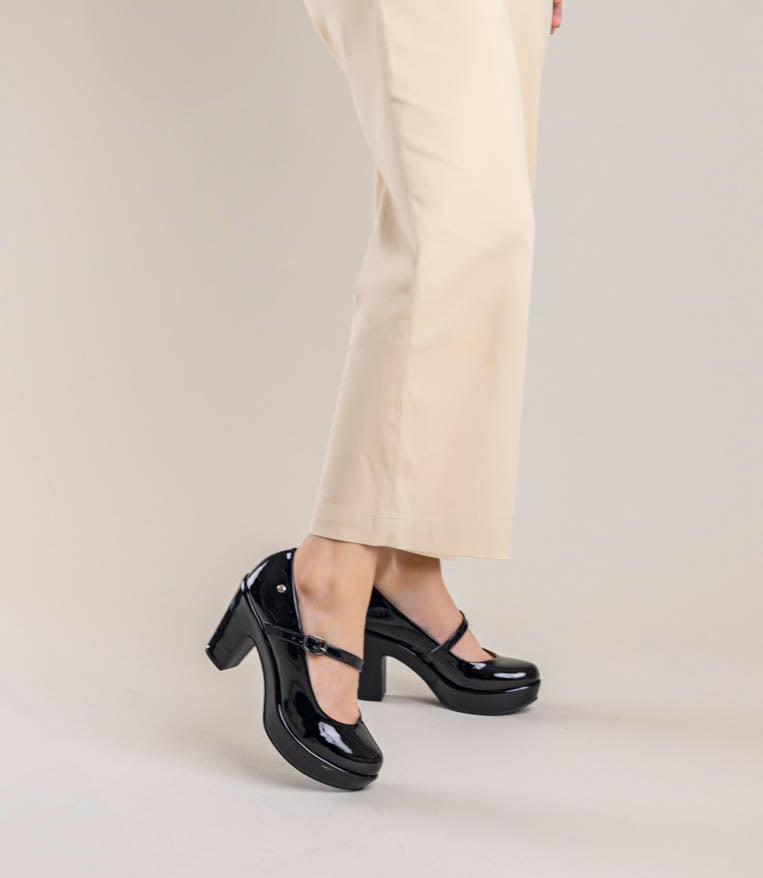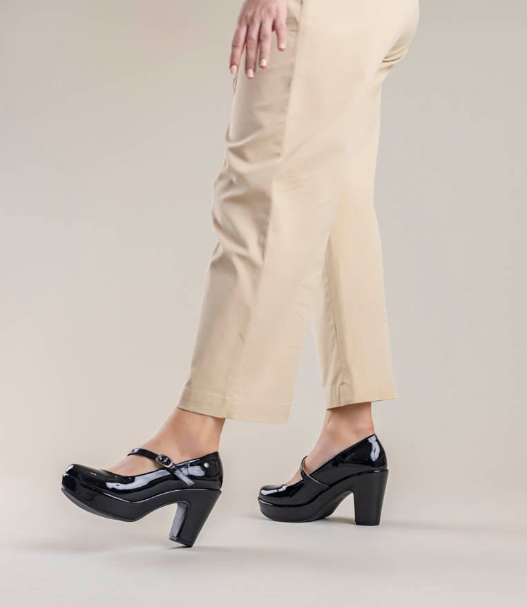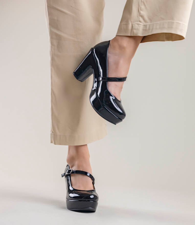 Lindos tacones de charol con trabita. 9 cm de alto y plataforma al frente. Muy cómodos.
